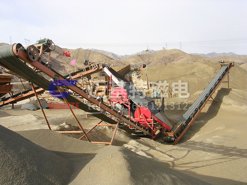被皮帶輸送機輸送的散狀物料,通過安裝在尾部支架上的磁選機(即旋轉的直流磁鐵)時,物料中的鐵磁雜物被吸,由棄鐵膠帶將鐵磁雜物拽至電動滾筒卸下,...